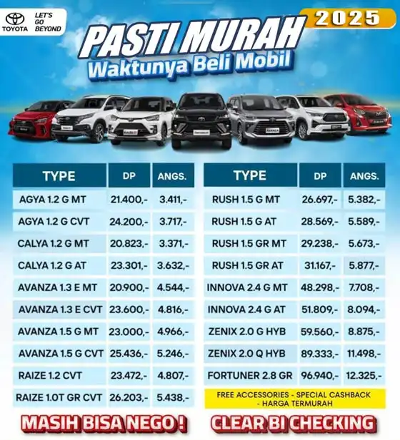 Gallery Toyota terbaru dan harga Toyota terbaru 2025. Harga berdasarkan update per bulan Mei 2025 khusus area Jakarta, Depok, Tangerang, Bekasi.